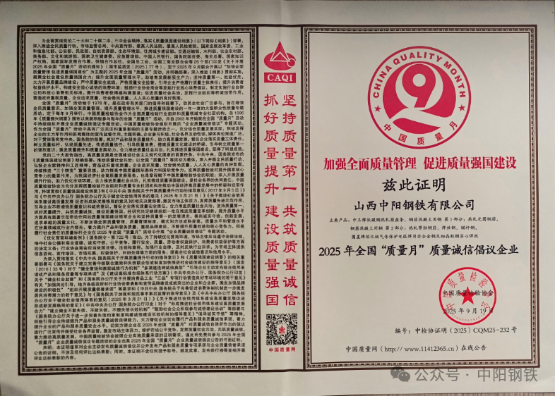 近日,在由市场监管总局、中央宣传部等26个部门共同部署开展的以“加强全面质量管理促进质量强国建设”为主题的2025年全国“质量月”活动中,中阳钢铁凭借自身产品品质、企业经营与品牌信誉方面的卓越表现,荣获“质量诚信倡议企业”称号。